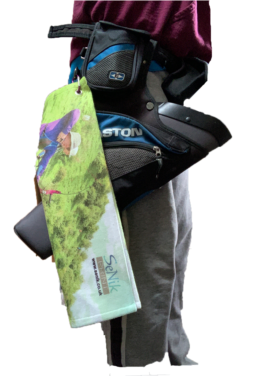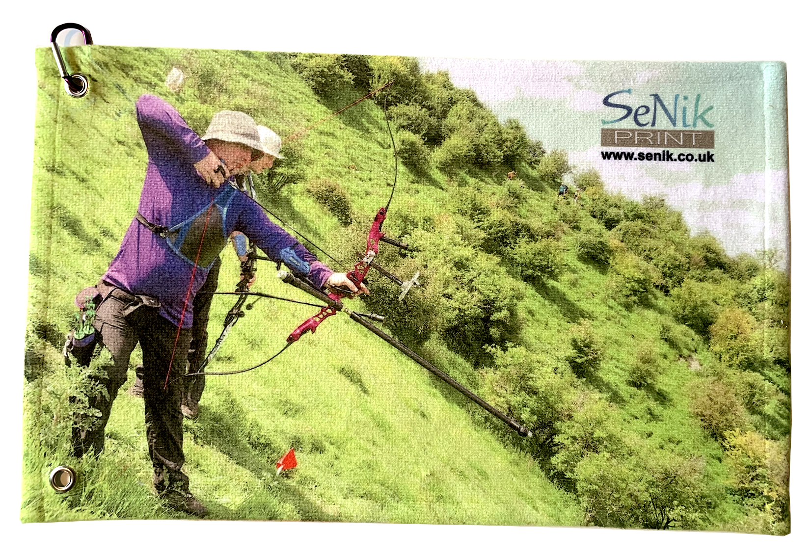 Personalised Microfibre towel, printed with an image of your choice - e.g your favourite photo of you shooting! Photos can be landscape or portrait. Finished with 2 eyelets and a carabiner clip for hanging from your quiver.